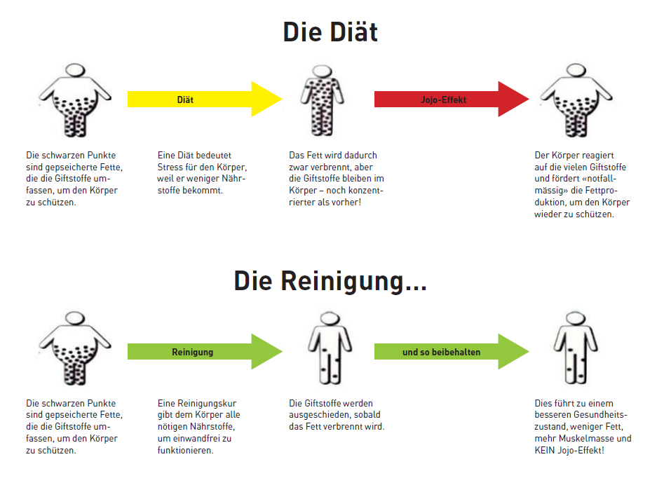 Wusstest Du, dass über 87% der Diäten nicht langfristig funktionieren? Das heisst bei über 87% der Diäten wiegen Menschen nach spätestens zwei Jahren wieder gleich viel oder sogar noch mehr, als vor der Diät. Der Grund für diese unglaublichen Zahlen ist die in vergessenheit geratene Körper-Reinigung. Nur wenn der Körper richtig gereinigt ist, ist die Grundlage für langfristigen Abnehmerfolg gegeben, sonst leitet der Körper von alleine einen Jojo-Effekt ein um sich mit mehr Fett vor unerwünschten Stoffen zu schützen